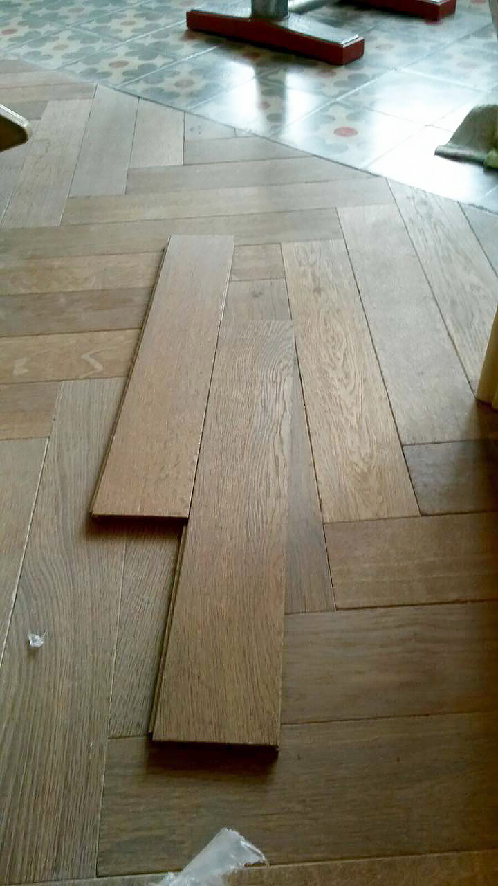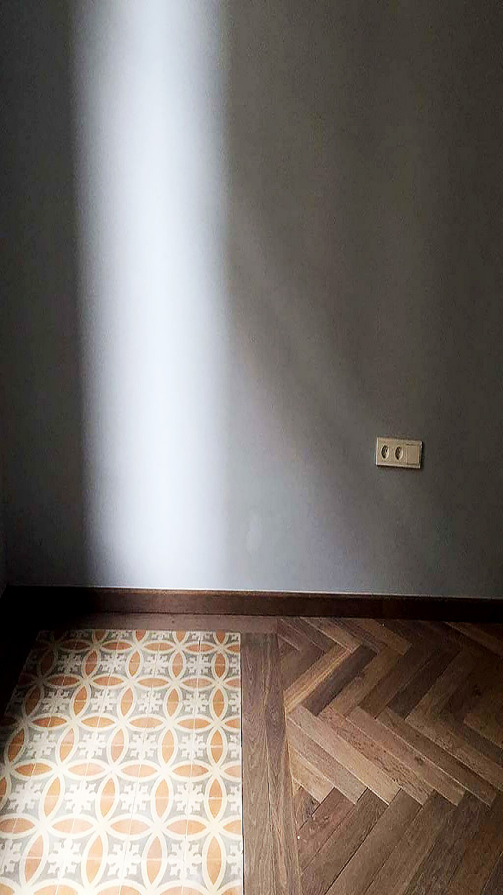 En un piso de un particular de Barcelona nos ocupamos del suministro y colocación de 120 metros cuadrados de roble envejecido en espiga de la marca Chene de L’Est.